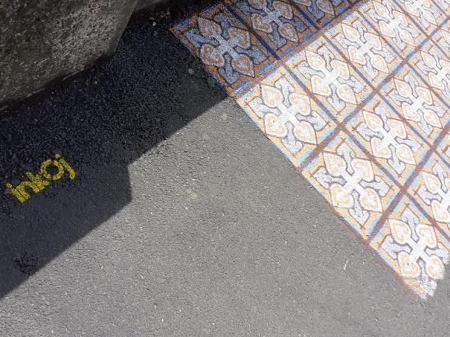 Cette fois, sa double démarche est d’embellir la rue par des surprises graphiques et de faire découvrir les trésors architecturaux ou artisanaux de nos villes par des fresques au sol réalisées à la bombe et au pochoir.