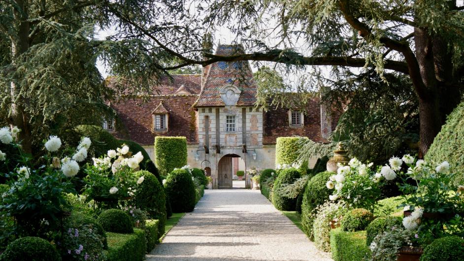 Une allée des cèdres s’élance imposante vers la poterne et le pont-levis du château où de part et d’autre de la promenade gravillonnée, des haies de buis et d’ifs se répondent dans une parfaite symétrie.