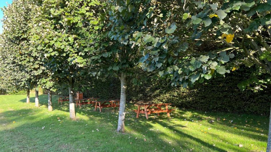Des cônes de charmes rythment les douves du château, une allée engazonnée bordée de banquettes de buis, de cylindre d’ifs surmontés de demi boules le tout ponctué de vases Médicis en terracotta conduit l’œil jusqu’à une tourelle d'angle du château.