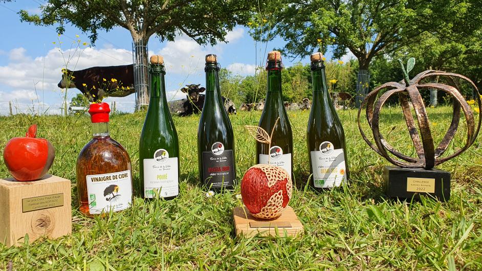 Produits biologiques 100% pur jus issus de nos 20 variétés de pommes et poires intégralement transformées sur la ferme :