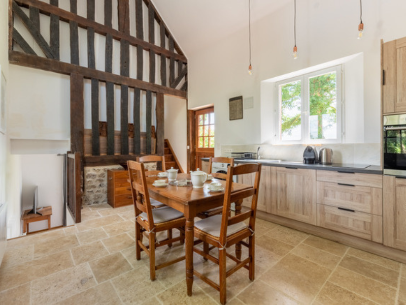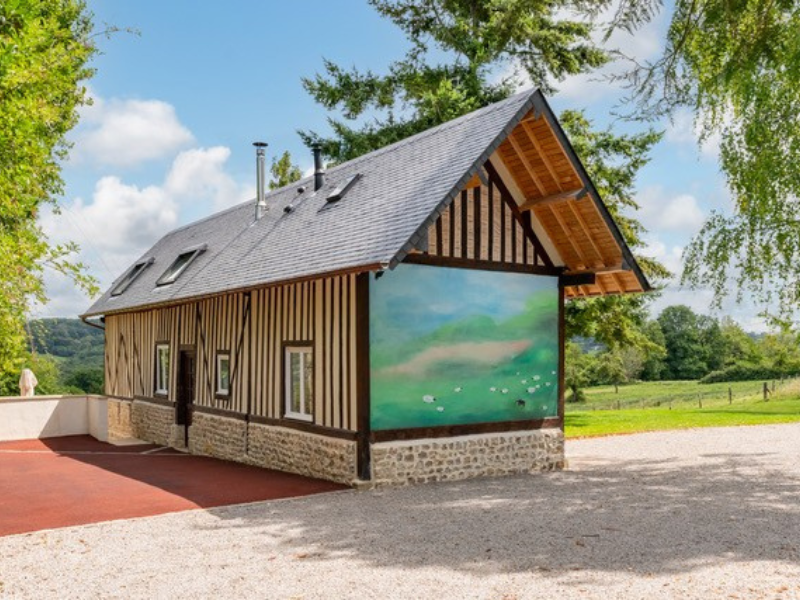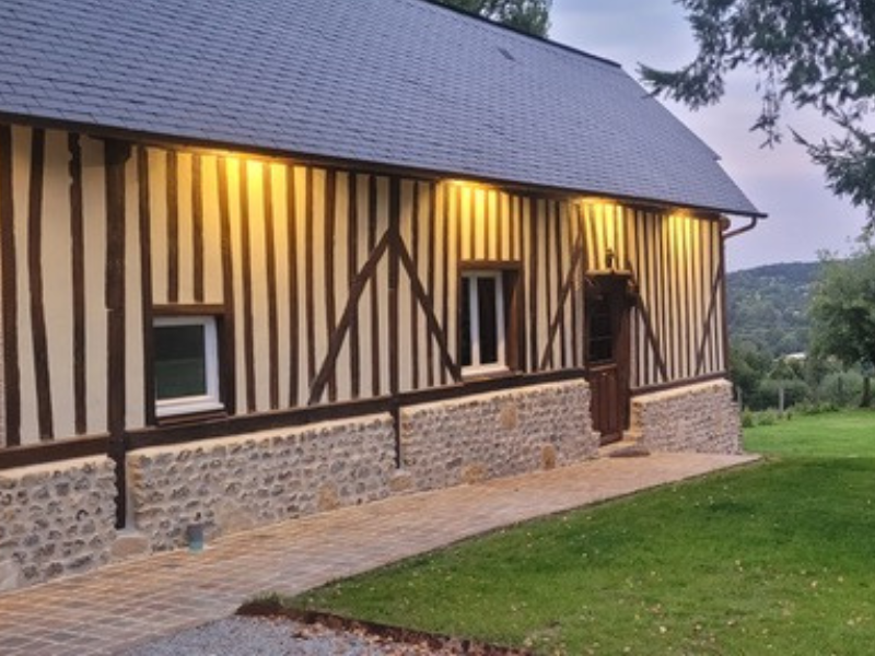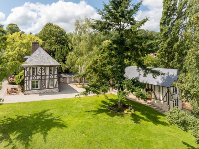 Cette maison à colombages a été récemment rénovée dans le plus pur style normand et fait partie d’un domaine où se trouve un manoir augeron du 18eme siècle, lieu de vie des propriétaires.